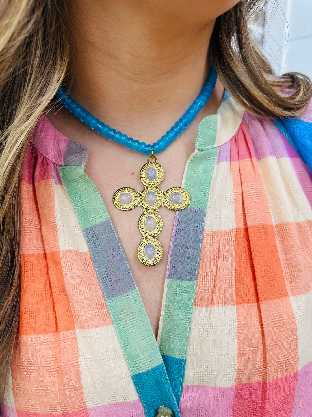 Blue Bead Cross Necklace