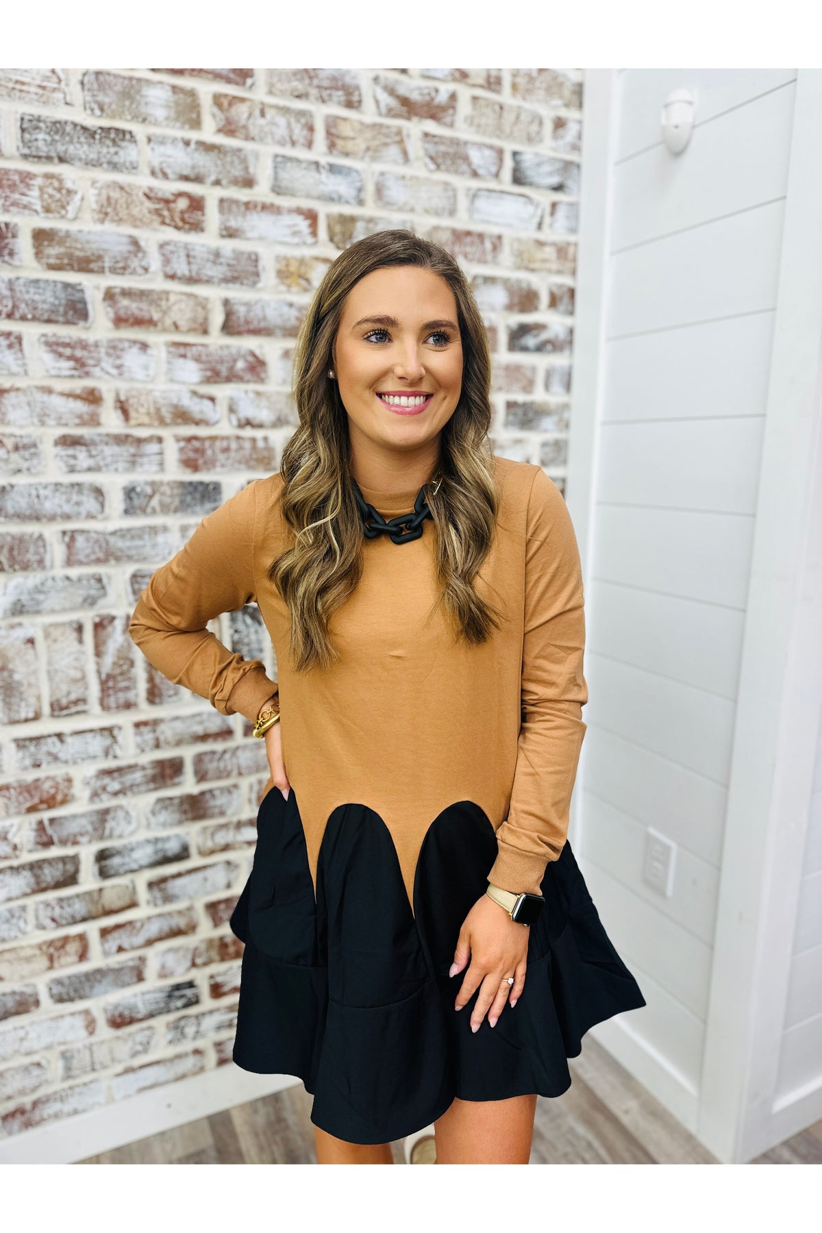 Get movin' in this playful tan dress with bold black trim. Perfect for any occasion, this dress adds a touch of fun to your wardrobe. Don't just make the move, make it in style with this dress!