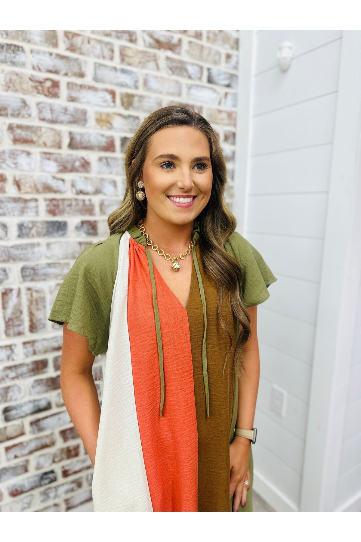 Get ready to fall in love with this THML midi dress! Featuring a playful colorblock style in rich autumn hues, this dress is perfect for any occasion. With flutter sleeves and a midi length, you'll be the style envy of the season. Don't miss out on this must-have piece!