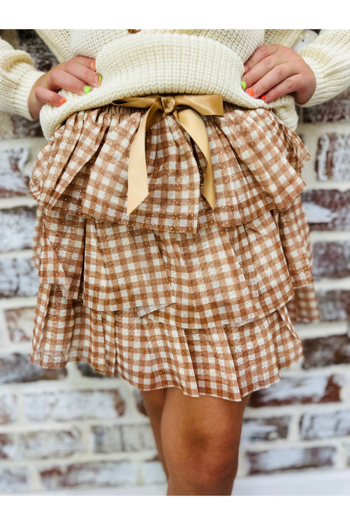Featuring soft brown-and-cream gingham layers with a subtle glitter finish, this tiered design is topped with a sweet satin bow at the waistband. Comfortable and twirl-ready, it’s ideal for fall outings, family photos, or adding a darling touch to everyday play.