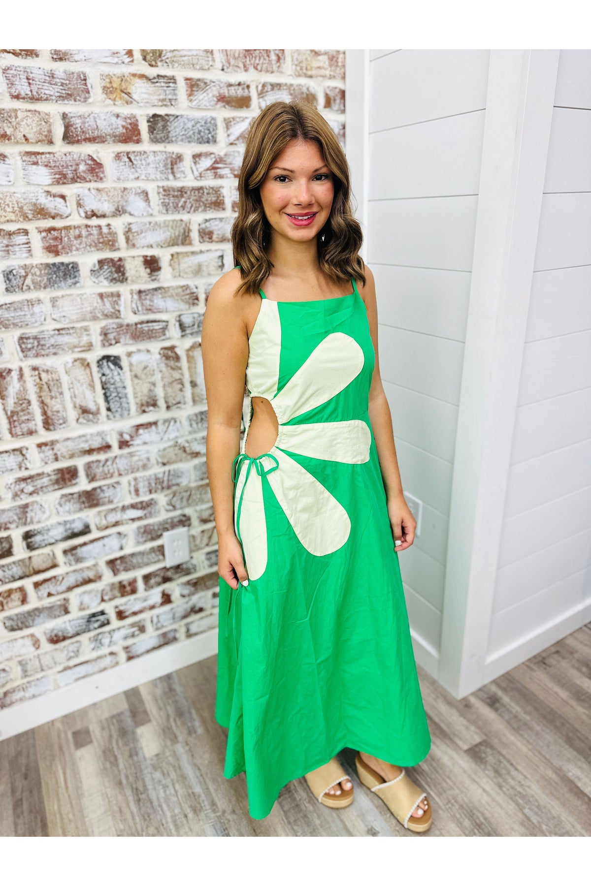 Step into sunshine with the Cut Out Flower Midi Dress! This fun dress features charming floral cut-outs that add a fresh, flirty twist to your look.  Let your style bloom and enjoy every moment in this delightful dress!