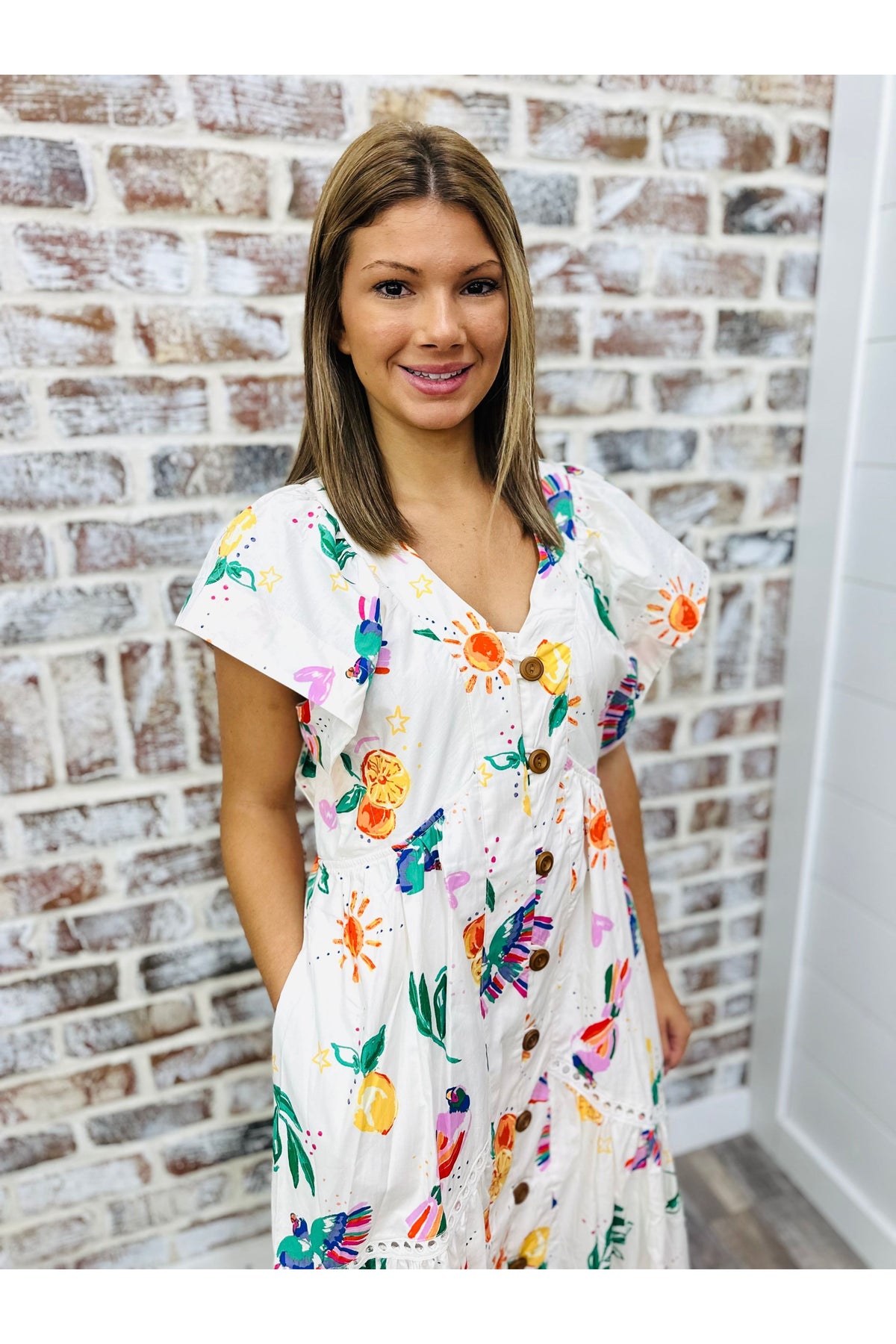 The KARLIE Toucan Fruit VNeck Maxi Dress is truly unique, with a colorful and eye-catching fruit design. Its maxi dress style offers both comfort and style, making it the perfect choice for any occasion. Don't settle for ordinary, stand out in this one-of-a-kind dress!