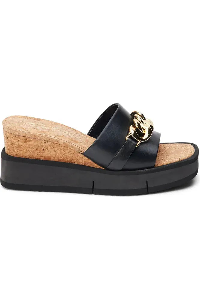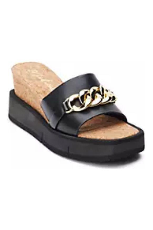 The Matisse "Nolan" sandal features a sleek black leather design with a bold chain detail on the front! The architectural heel adds a modern touch to this classic silhouette, making it perfect for both casual and dressy occasions. Step out in style with these edgy and sophisticated sandals from Matisse.