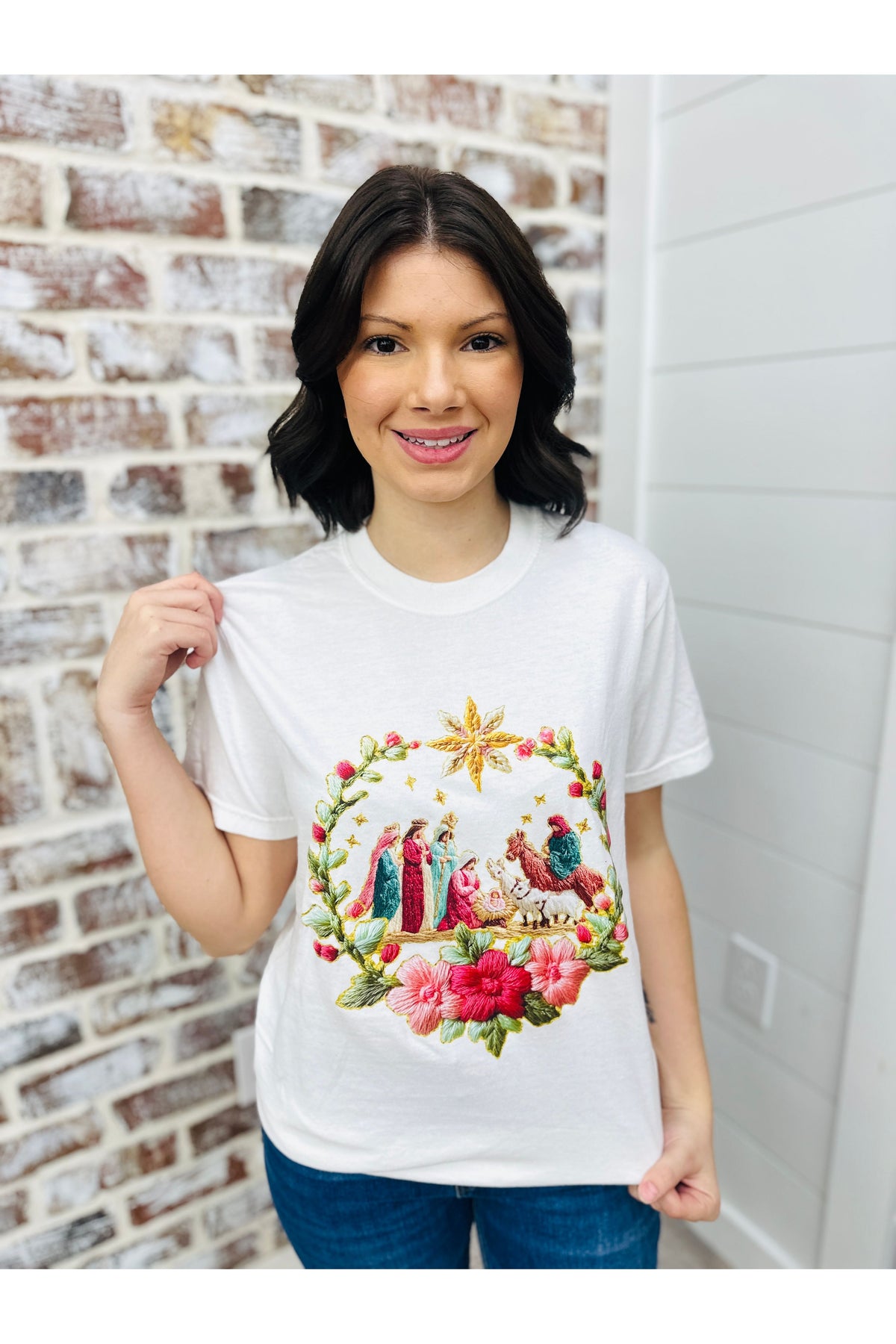 This tee is a true Christmas miracle! With a faux French knot nativity scene on a crisp white background, it's the perfect blend of holy and trendy. Spread some holiday cheer with this quirky tee.