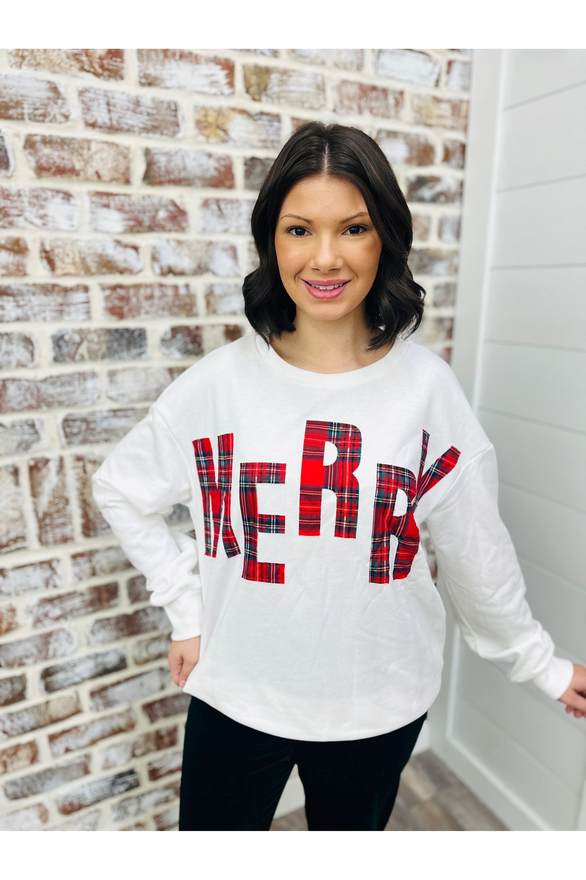 Get cozy and festive with our Plaid Merry Sweatshirt! This white sweatshirt features a fun plaid print that will have you feeling merry all season long. Perfect for lounging or spreading holiday cheer, this sweatshirt is a must-have for any festive wardrobe!