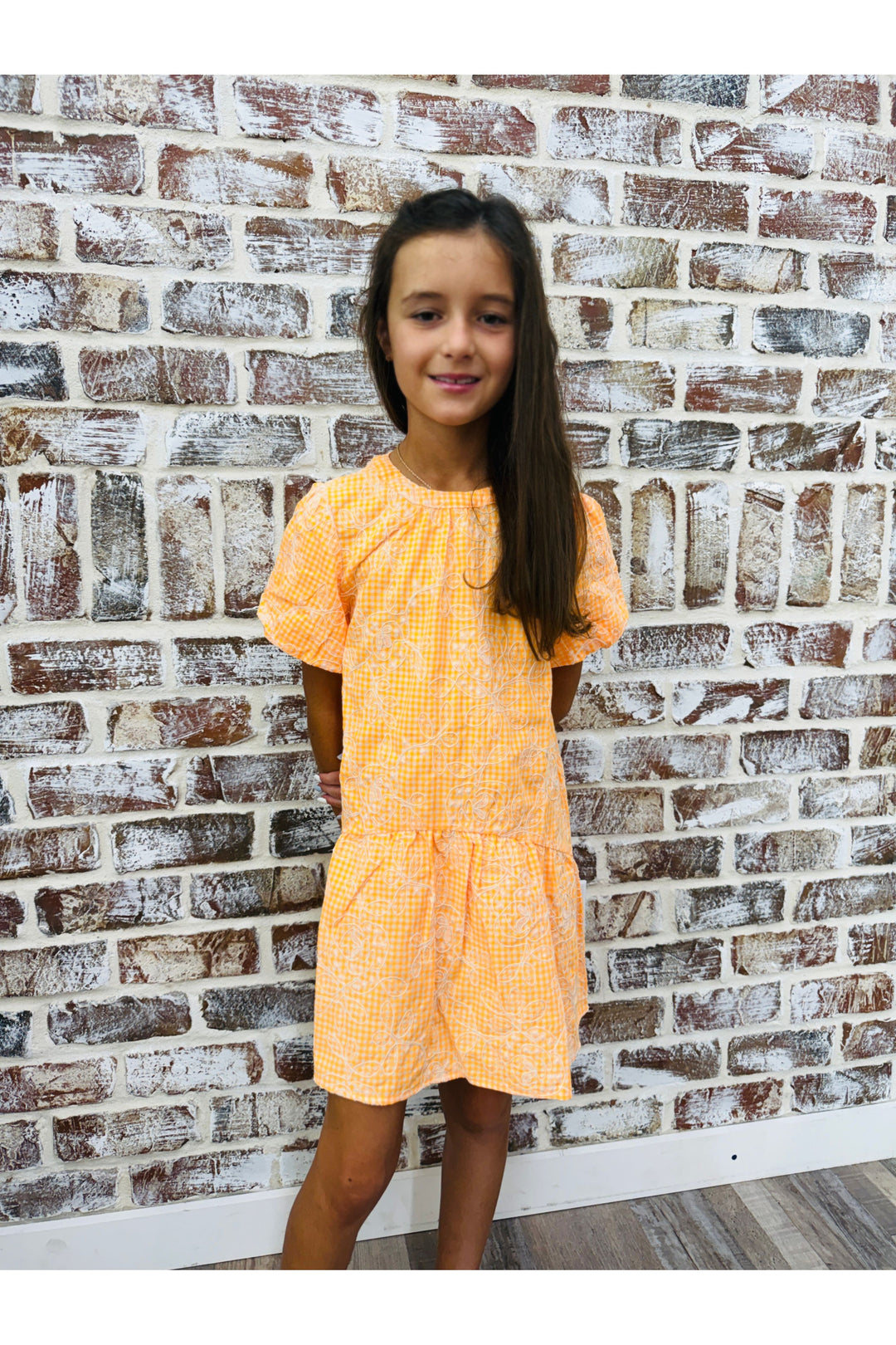 Girls Orange Embroidered Gingham Dress