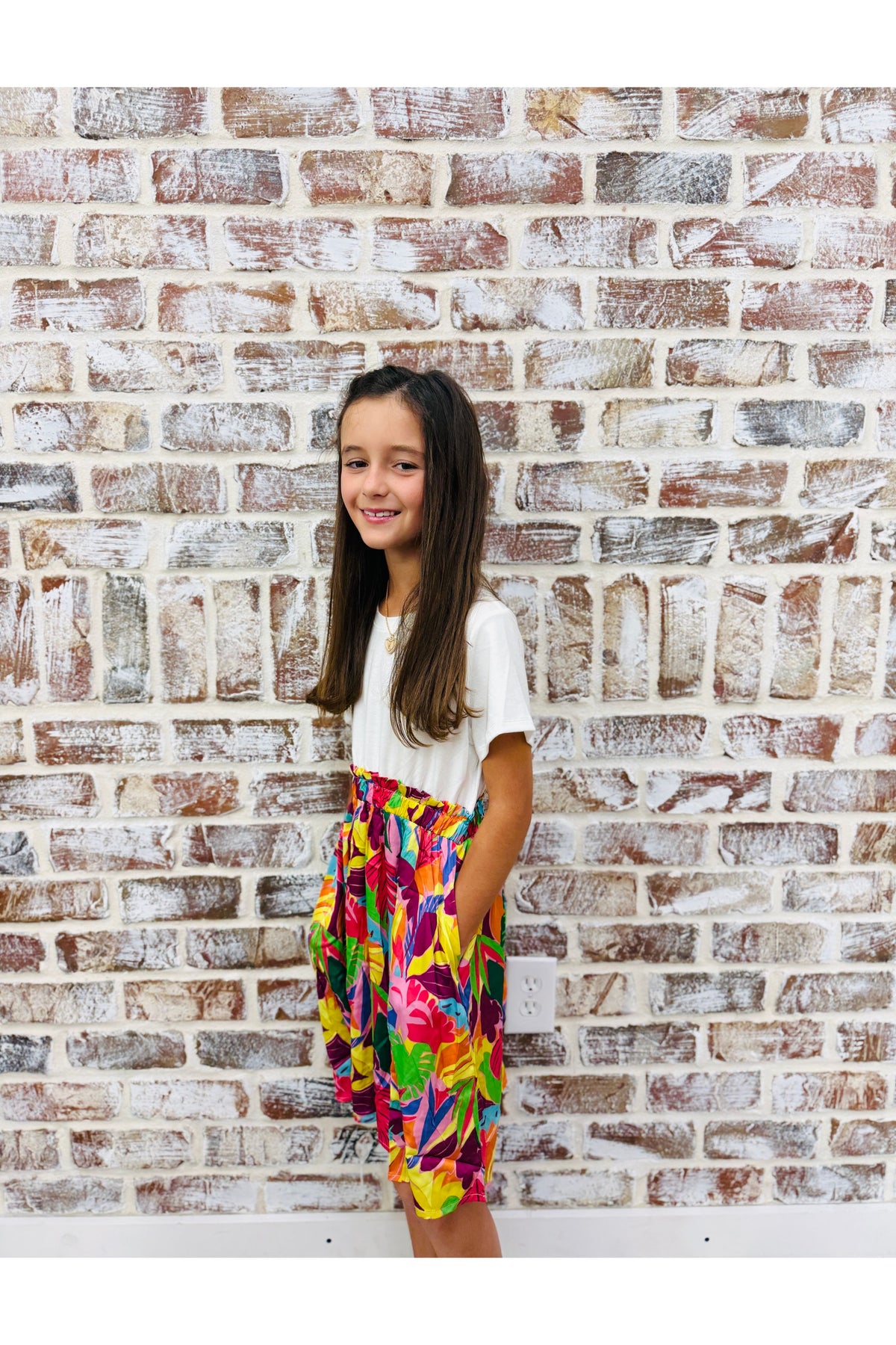 Embrace a touch of paradise with our Youth Tropical Satin Chiffon Mixed Media Dress. This charming white dress features a vibrant tropical printed skirt, perfect for summer outings or special occasions. Fashionable and fun, it offers a playful style that keeps your little one comfortable and ready for adventure!
