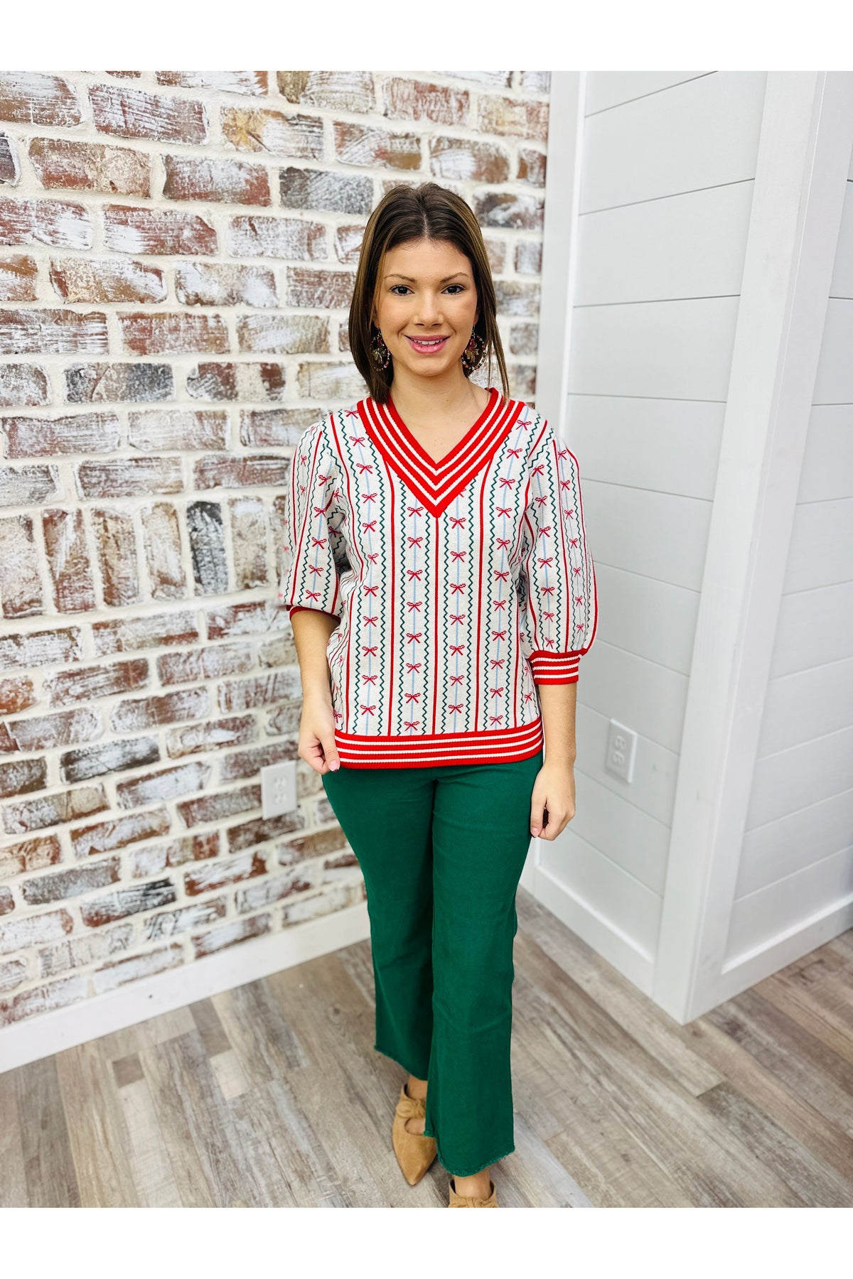 Introducing Mary Square's Sweater Faith In A Bow Top - the perfect holiday print for any occasion. Show off your playful side with the quirky bow print, while also proudly displaying your faith. Stay comfortable and stylish with this unique top.