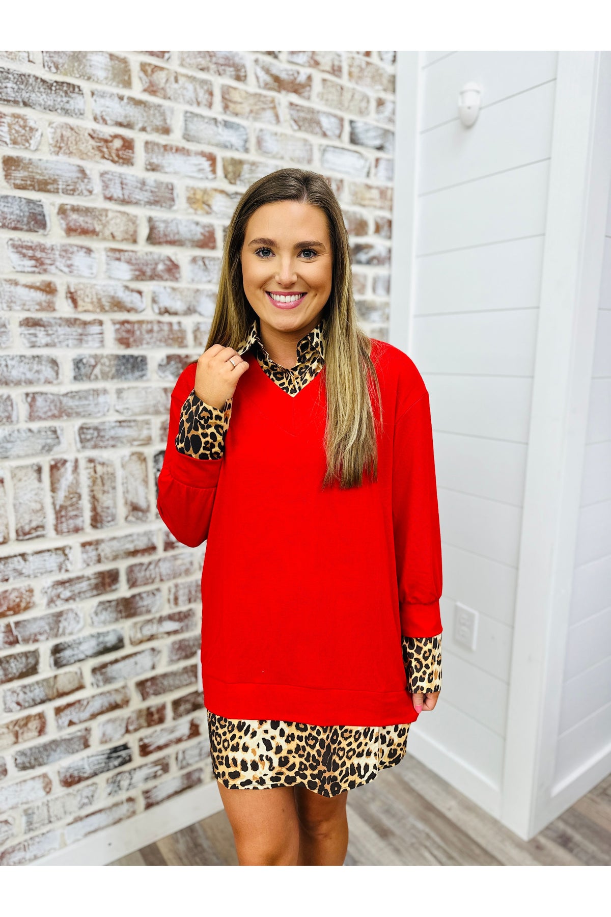 Unleash your wild side with this red shirt featuring a leopard button-down dress. Not only is it fashionable, but it also lets you show off your unique style. Go ahead, be bold and stand out from the crowd in this quirky and playful ensemble!