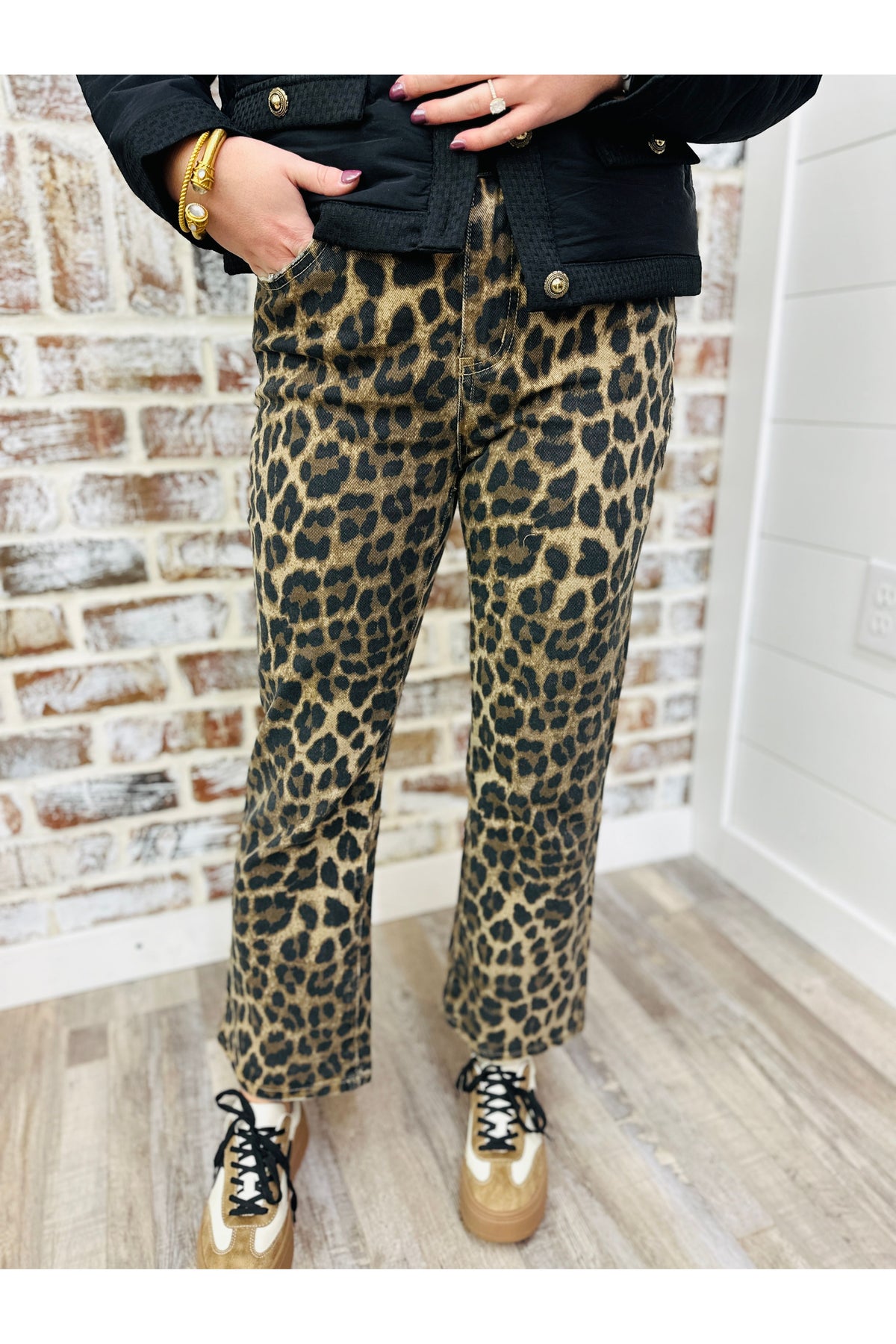 High rise leopard print kick flare jeans Comfort stretch denim, high rise waist, cropped length, leopard print, kick flare jeans F. Rise: 10 1/2" / inseam: 27" / leg opening: 17"