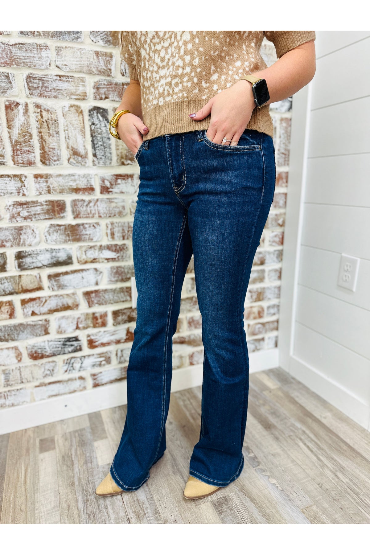 Mid rise super flare jeans Comfort stretch denim, mid rise waist, finished hem, full length, super flare jeans F. Rise: 9" / inseam: 33 1/2" / leg opening: 22"