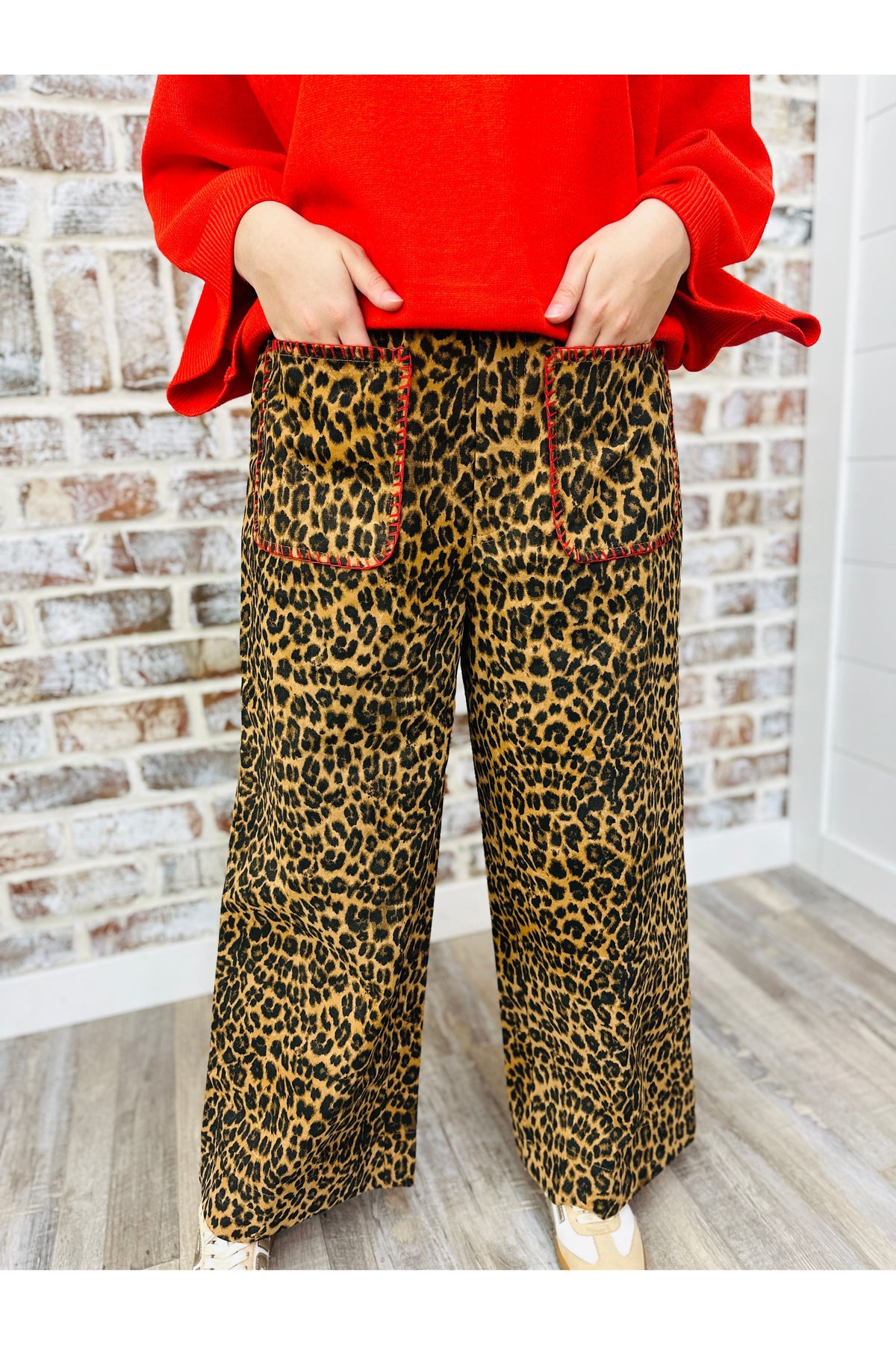 Unleash your inner wild side with these Cheetah pants featuring fierce red stitched pockets. Stand out and make a statement with this playful and stylish addition to your wardrobe. Perfect for adding a pop of fun to any outfit!