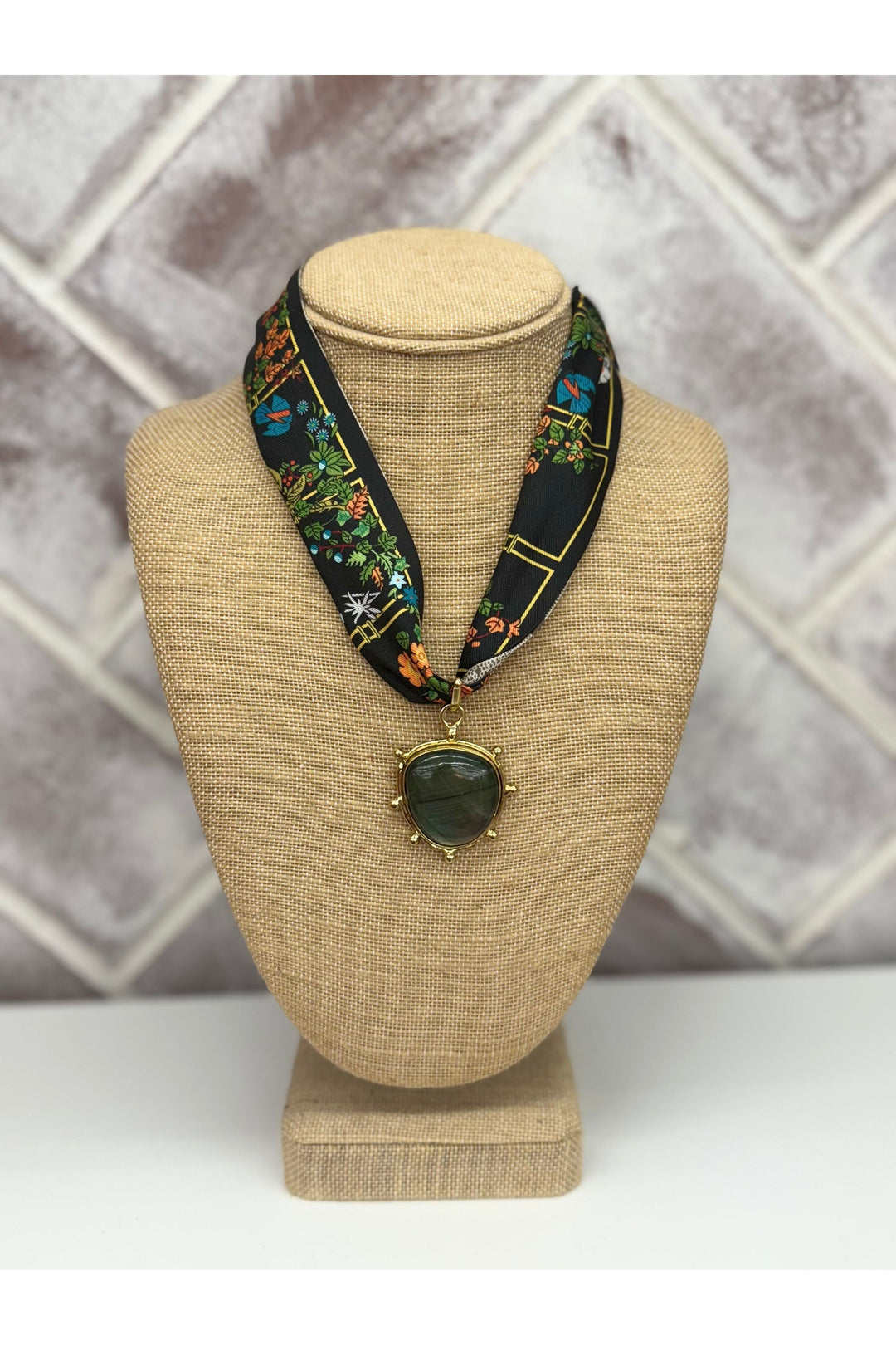 Black Scarf Necklace With Fall Flowers Design and Olive Charm