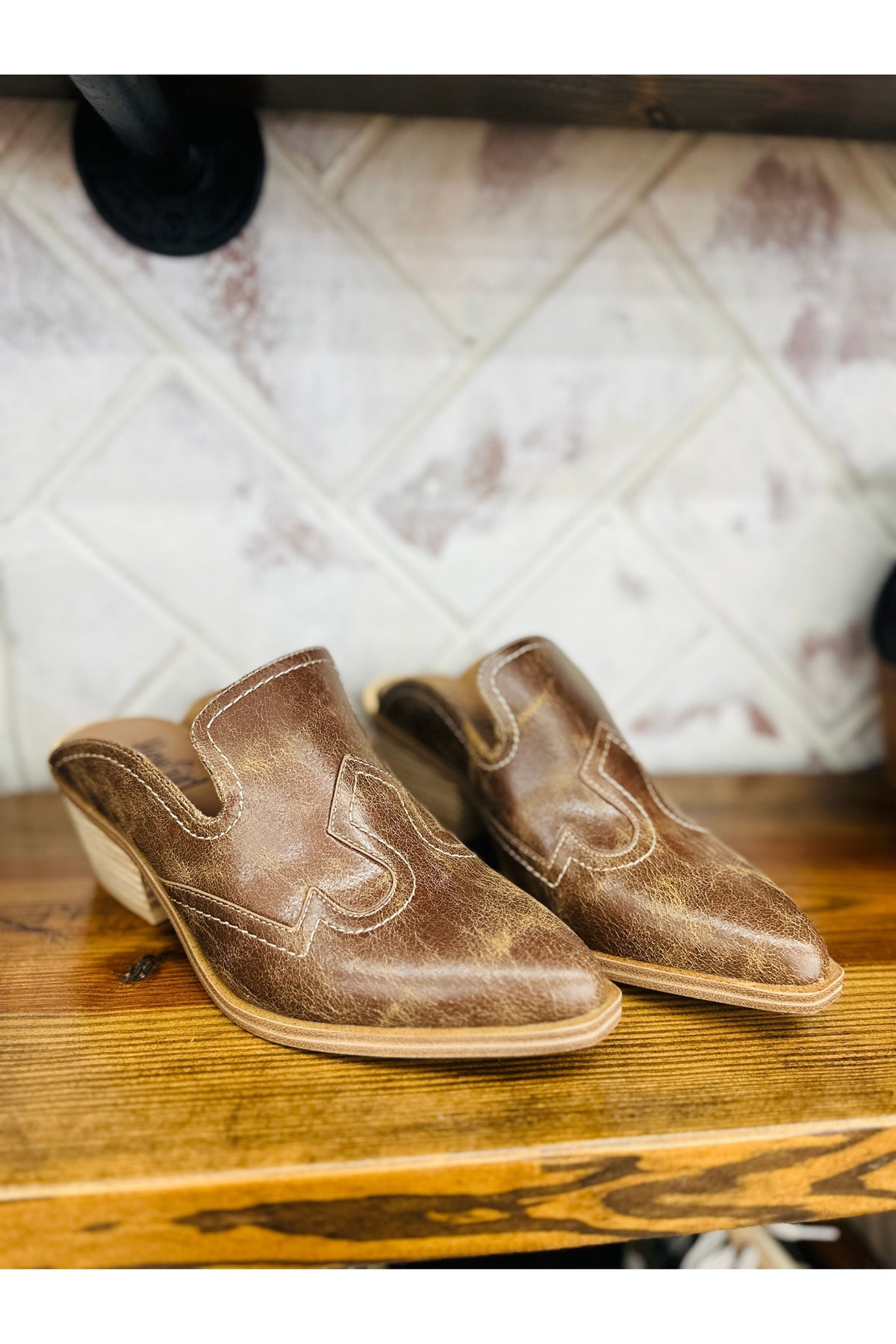 These mules have a rustic western-inspired look with a modern twist. Here are the details:
