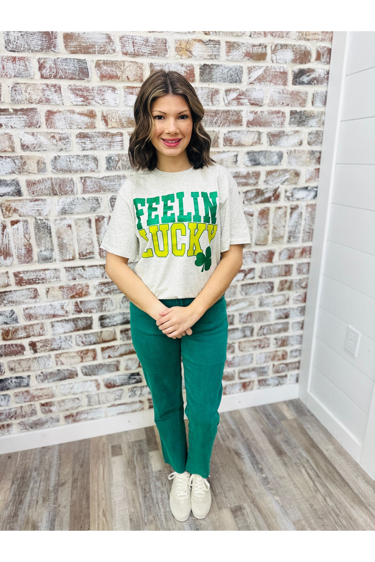 Get ready to shine with the Feelin Lucky Glitter Tee! This fun and stylish t-shirt features a sparkling "feelin lucky" design that adds a playful touch to any outfit. Perfect for casual outings or dressing up for a night out, wear your luck with confidence!