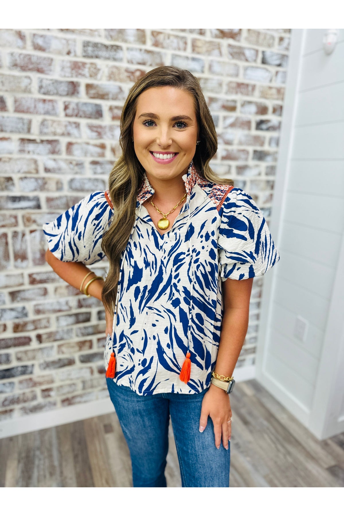 This Blue + Orange Detailed Top features a unique smocked neck and shoulder detail, adding a touch of style to your everyday look. The vibrant combination of blue and orange adds a pop of color to any outfit. Elevate your wardrobe with this versatile and eye-catching top.