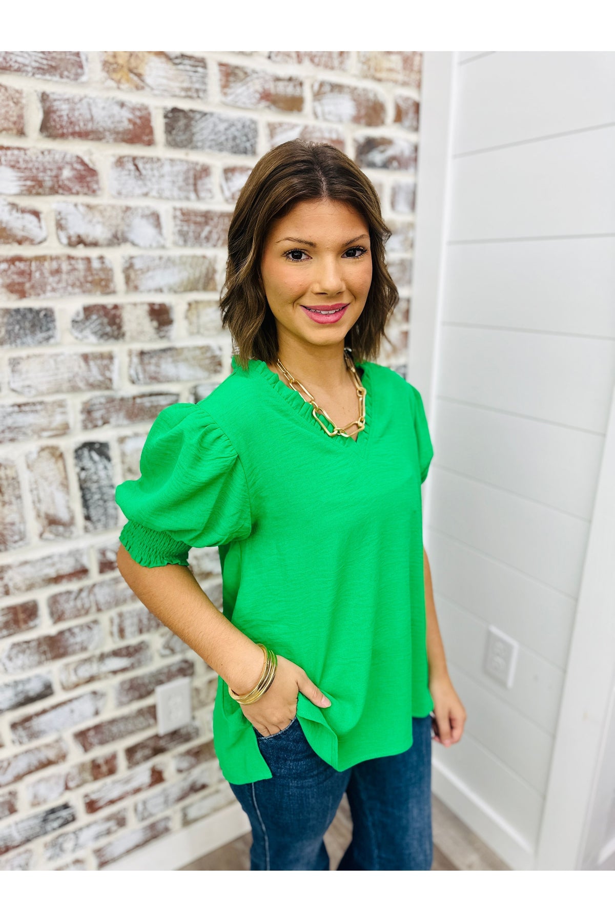 This Kelly Green Top features a delicate ruffle detail, adding texture and dimension to your look. Made of high-quality fabric, this top is perfect for adding a pop of color to any outfit. Stay on trend and effortlessly stylish with this versatile piece.