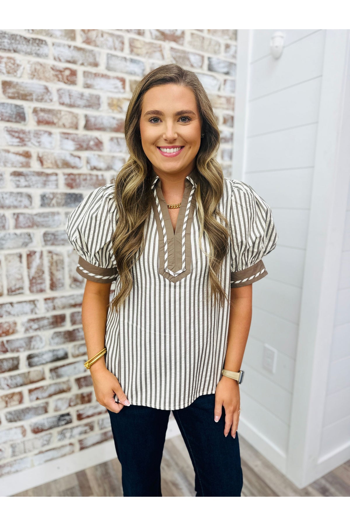 This V-Mocha Stripes Top features eye-catching band puff sleeve and contrast split details, adding a touch of personality to your outfit. Stay stylish and comfortable with this versatile top. Perfect for any occasion, it's a must-have addition to your wardrobe!