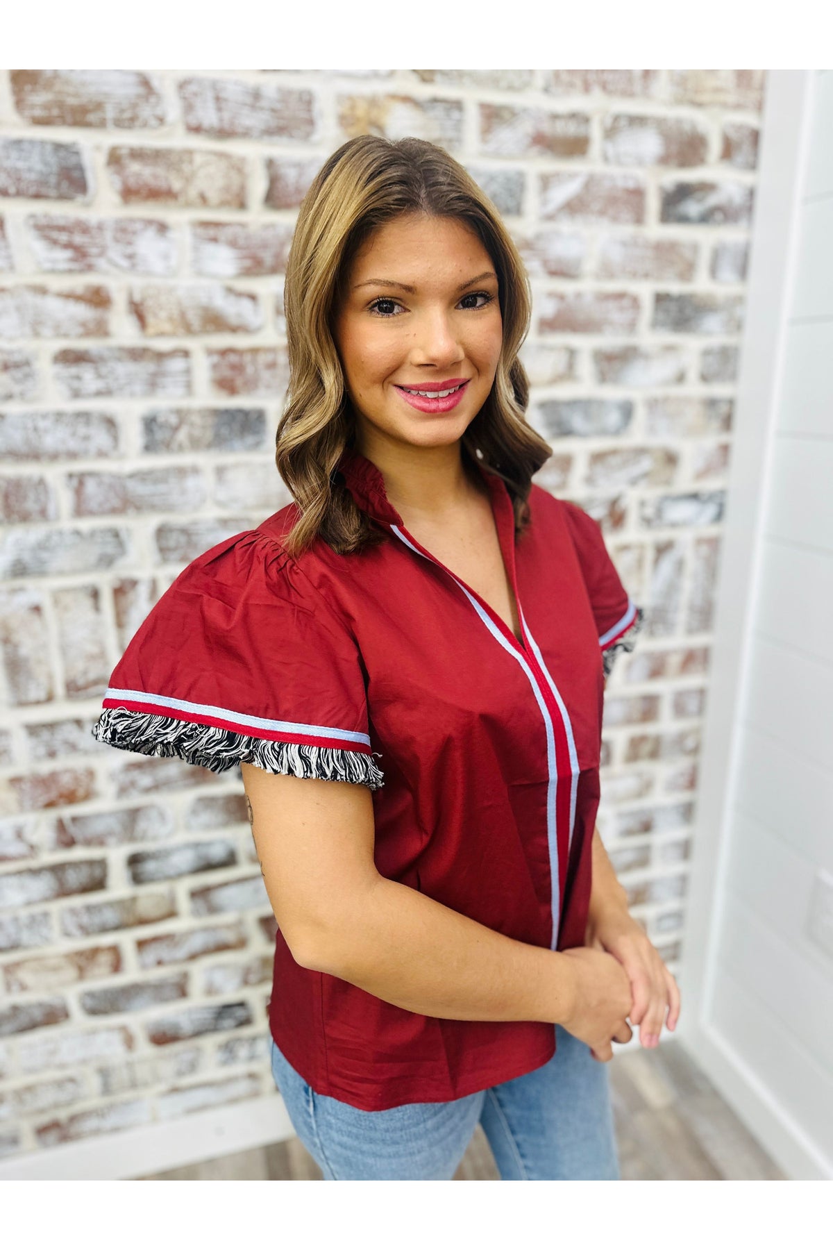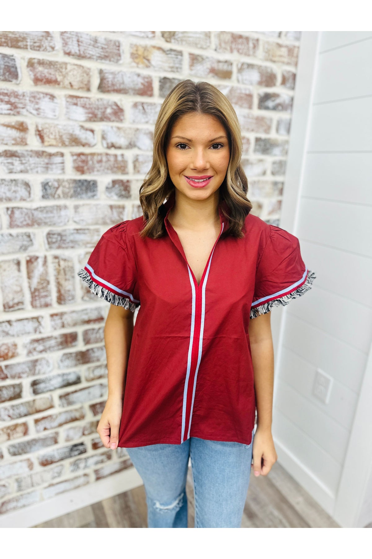 This THML Fringy Feels Top features trendy fringe detailing and a rich wine color. Elevate your wardrobe with this stylish and versatile top, perfect for any occasion. Add a touch of texture and color to your look with this must-have piece.