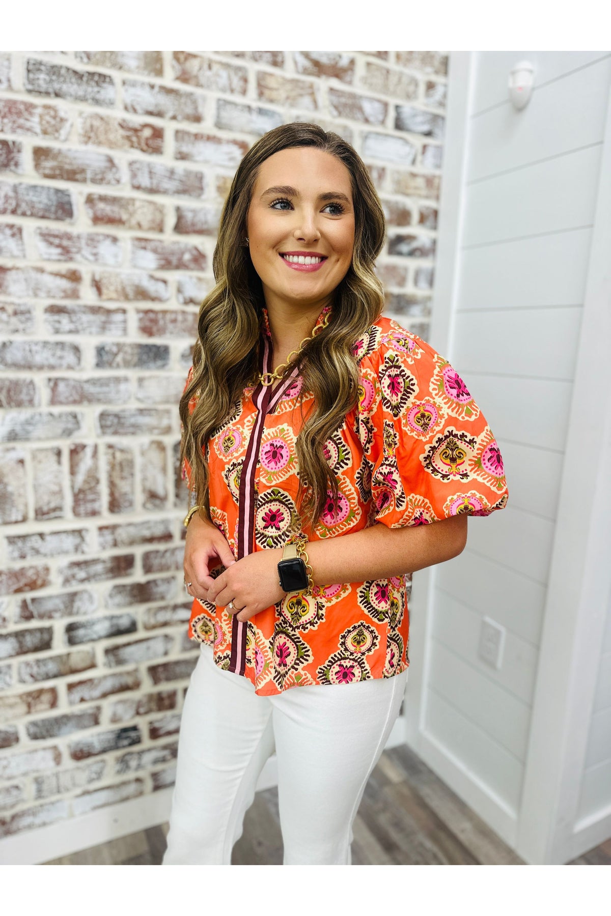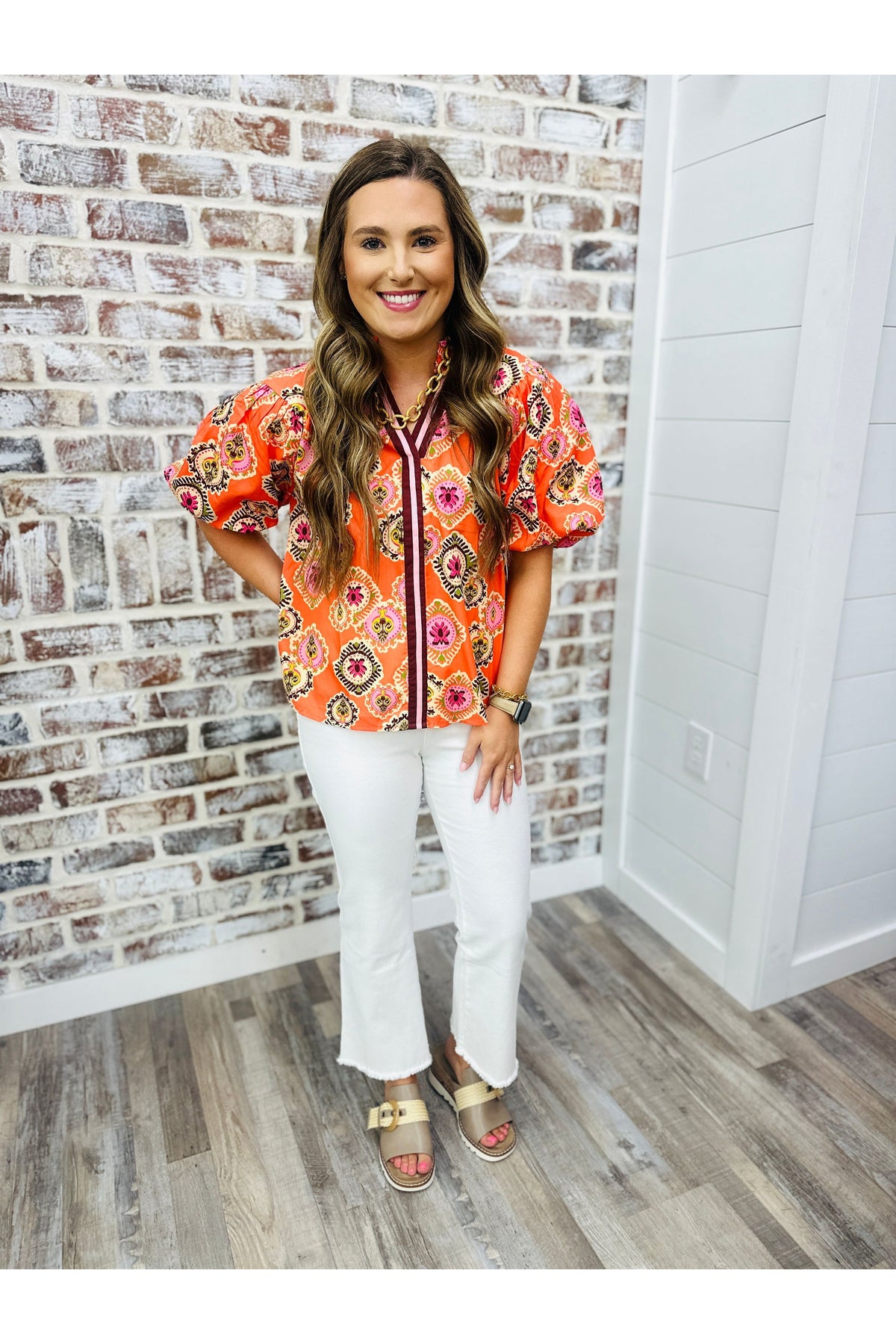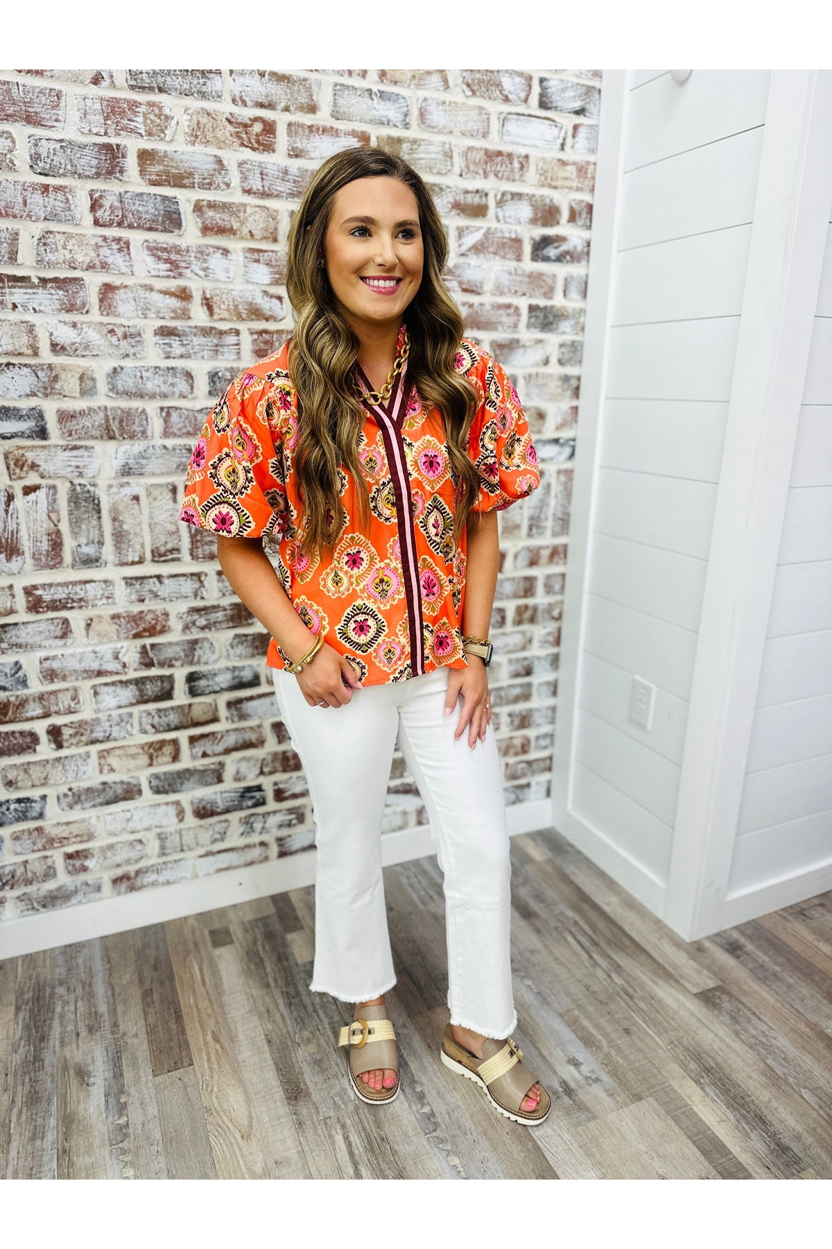 Get ready to turn heads with the THML Rust Design Top! The unique neckline and stunning design in a rich rust color make this top a must-have for your wardrobe. Stand out from the crowd and make a statement with this gorgeous top!