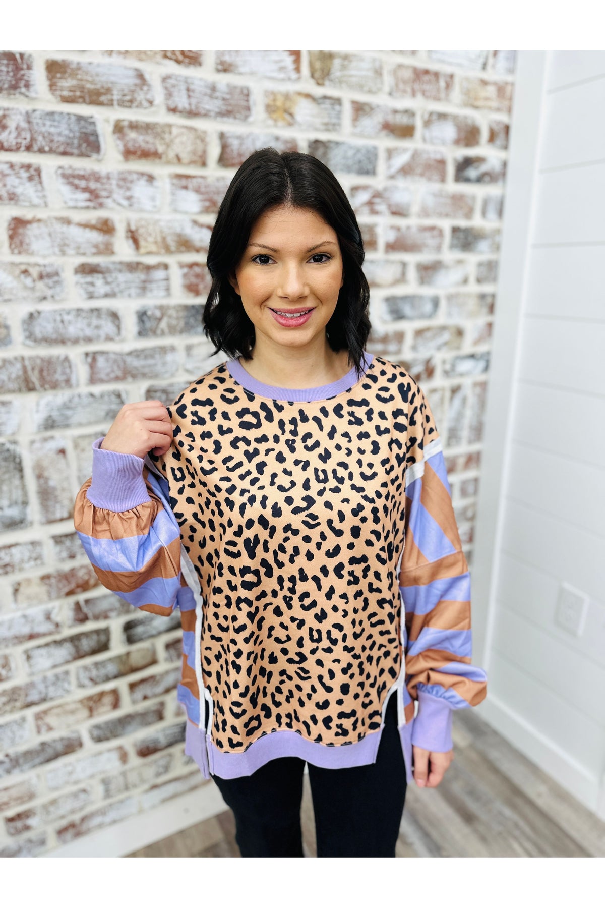Bold, playful, and oh-so-cozy! This mixed-print top is where leopard sass meets striped fun. With its relaxed fit, soft fabric, and pops of lavender, it’s the statement piece your fall wardrobe needs!