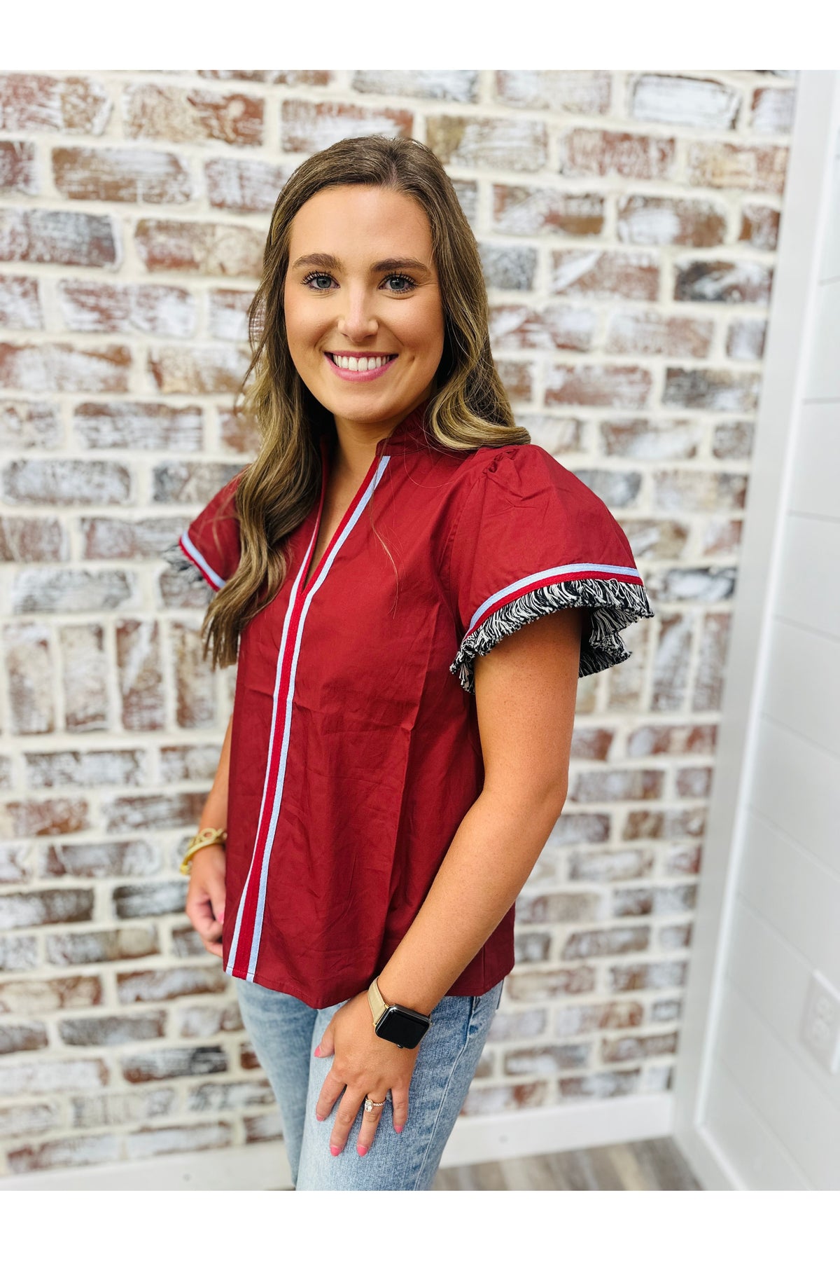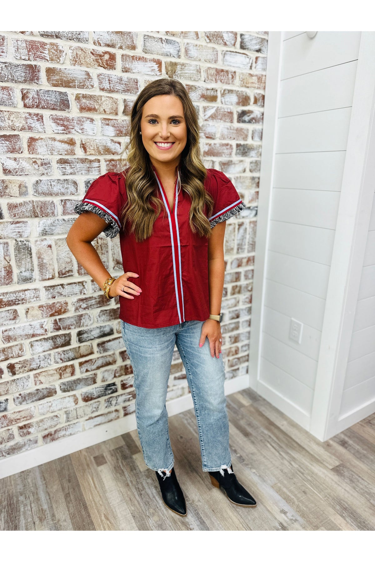 This THML Fringy Feels Top features trendy fringe detailing and a rich wine color. Elevate your wardrobe with this stylish and versatile top, perfect for any occasion. Add a touch of texture and color to your look with this must-have piece.